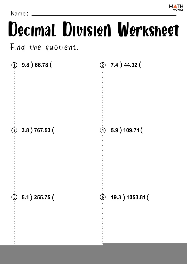 Dividing decimals can be a challenging concept for students to grasp. It involves understanding how to divide numbers with decimal points and can often lead to confusion. One way to help students master this concept is by using dividing decimals worksheets. These worksheets provide practice problems and exercises that allow students to work on their division skills with decimals in a structured and organized manner.