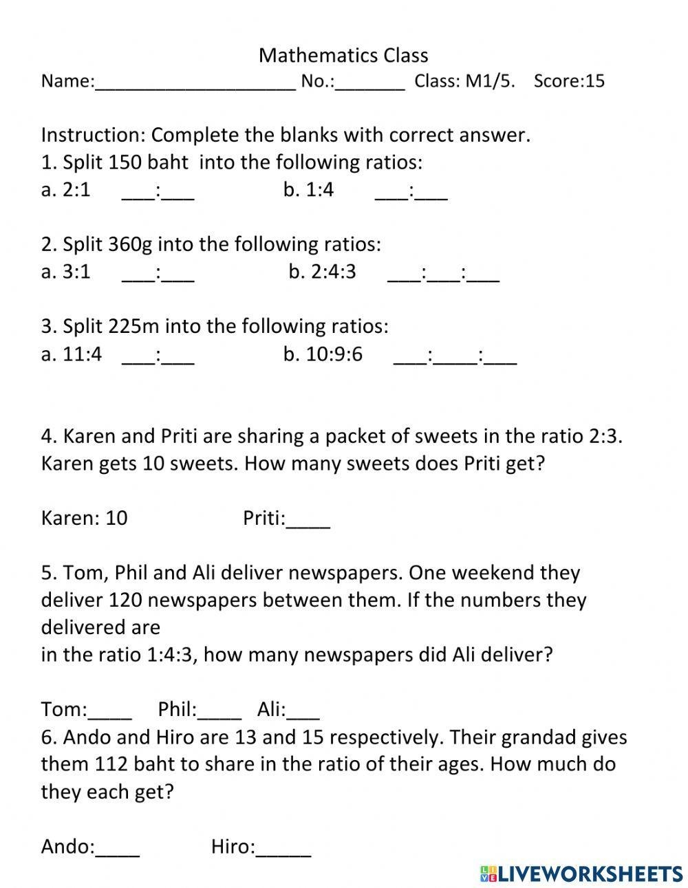 Students also practice solving ratio problems in these worksheets. They are given word problems that involve ratios and are asked to find the missing quantity or calculate the ratio between different quantities. This helps students apply their knowledge of ratios to real-world situations and develop their problem-solving skills.