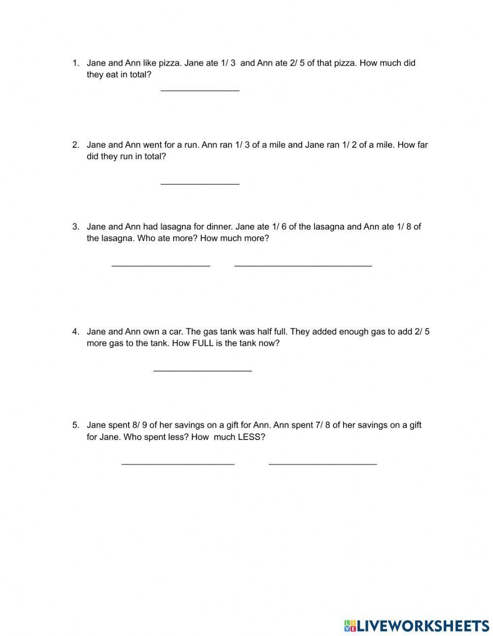 Adding and Subtracting Fractions with Unlike Denominators Worksheet