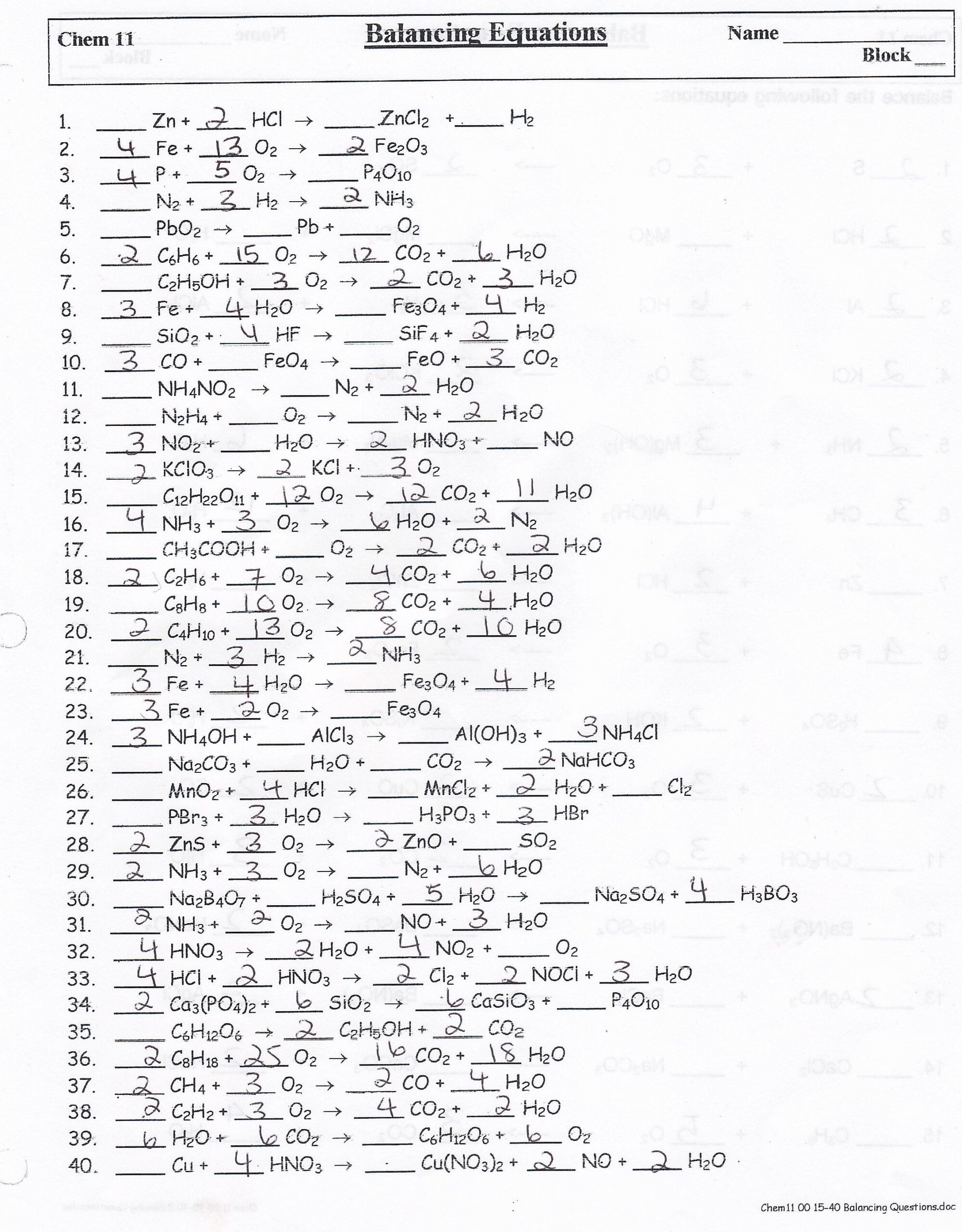 These worksheets typically consist of unbalanced chemical equations that students need to balance by adjusting the coefficients of the compounds. By doing so, students learn how to conserve mass and charge in chemical reactions, as well as understand the concept of stoichiometry.