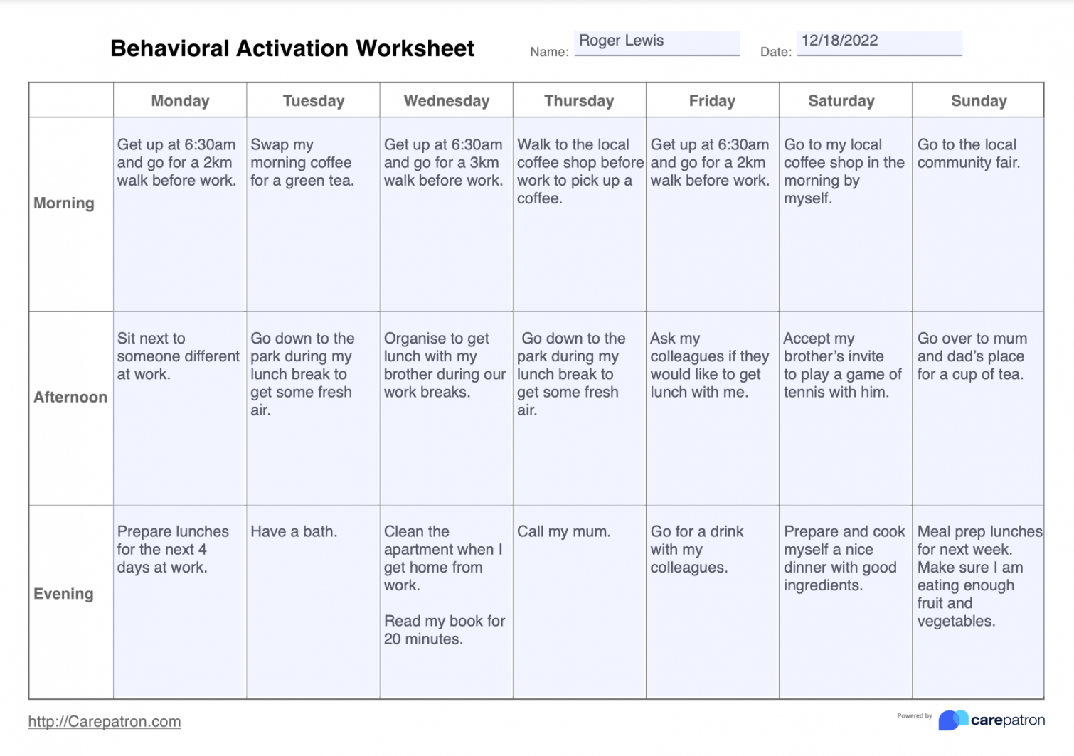 This worksheet is designed to help individuals identify activities that they enjoy and that give them a sense of purpose. By scheduling and engaging in these activities, individuals can increase their motivation, improve their mood, and build a sense of accomplishment.