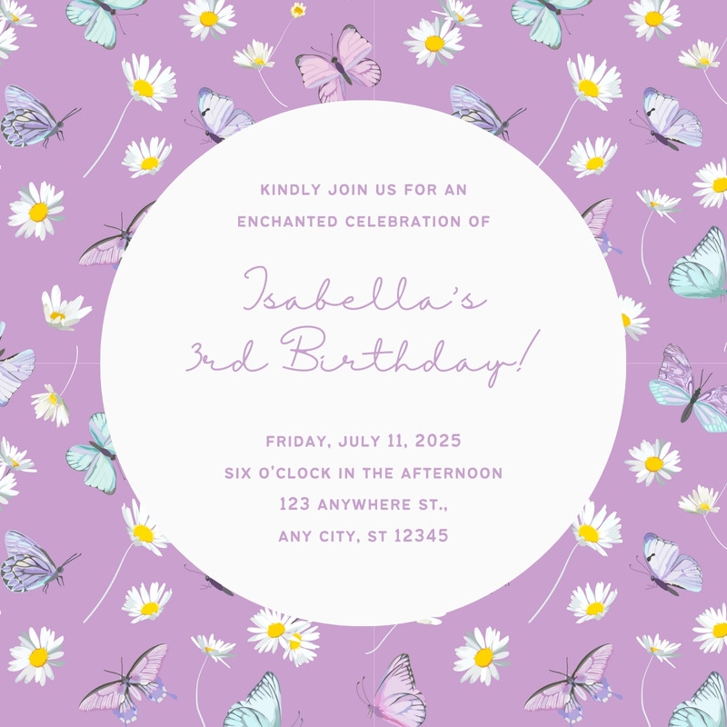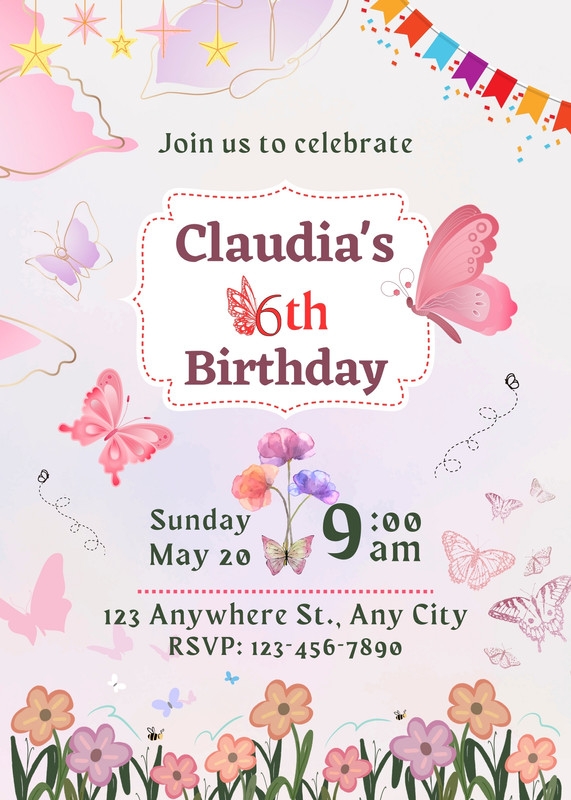 For a whimsical touch, try a butterfly fairy tale invitation template. This design features whimsical illustrations of butterflies, flowers, and other magical elements, creating a fairy tale-like atmosphere. It’s perfect for children’s birthdays or themed parties and can be personalized with your child’s name and age.