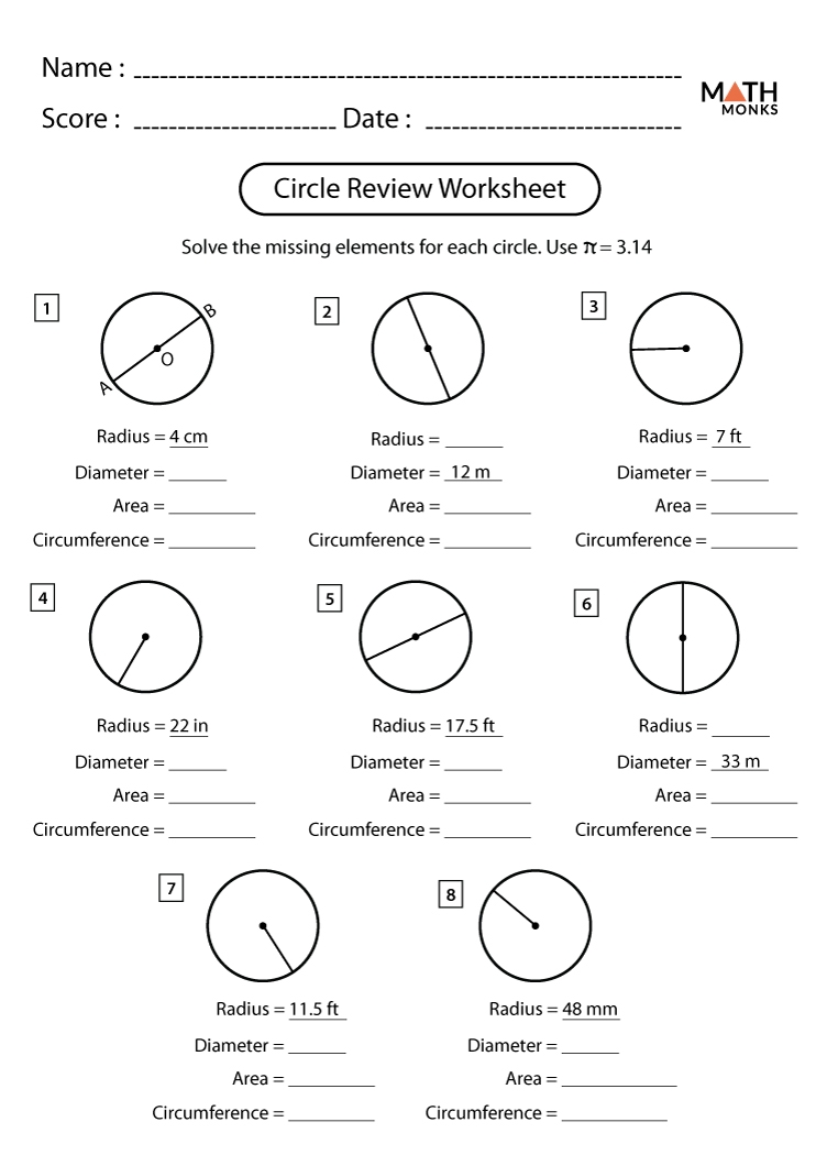 One common type of circle worksheet involves calculating the circumference and area of circles. Students are given the radius or diameter of a circle and must use the appropriate formulas to find the circumference (C = 2πr or C = πd) and area (A = πr^2) of the circle. These exercises help students practice applying mathematical formulas and concepts in real-world scenarios.