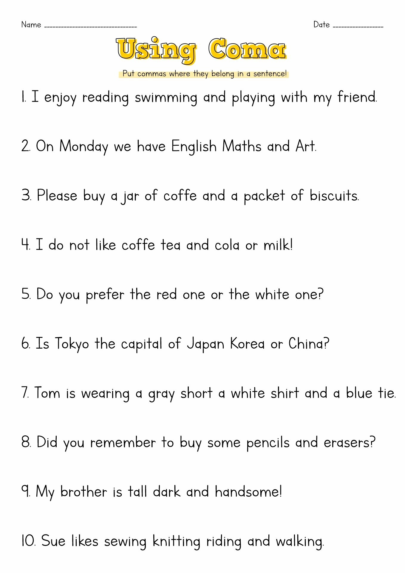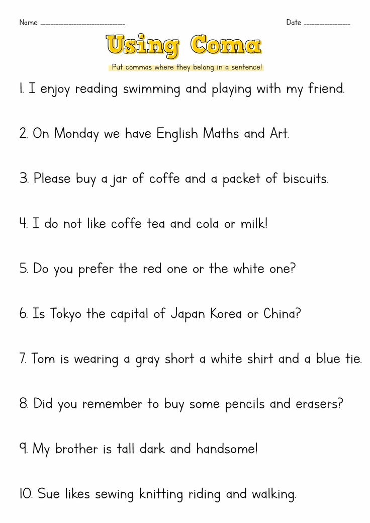 Comma worksheets are a valuable tool for students to practice and improve their comma usage skills. These worksheets typically contain exercises that require students to identify and insert commas in sentences, paragraphs, and other types of writing. By completing these worksheets, students can enhance their understanding of when and how to use commas effectively.