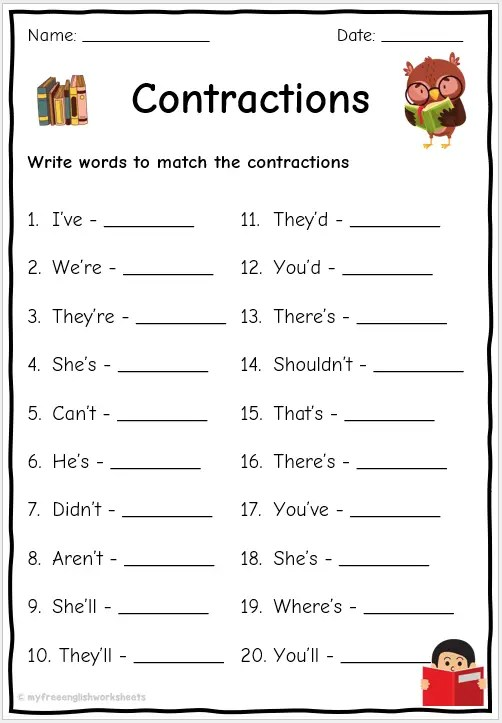 Furthermore, contraction worksheets can be a fun and engaging way for students to practice their language skills. Many worksheets include activities such as matching contractions to their full forms, filling in the blanks with the correct contractions, and creating sentences using contractions. These interactive exercises can make learning about contractions more enjoyable for students.