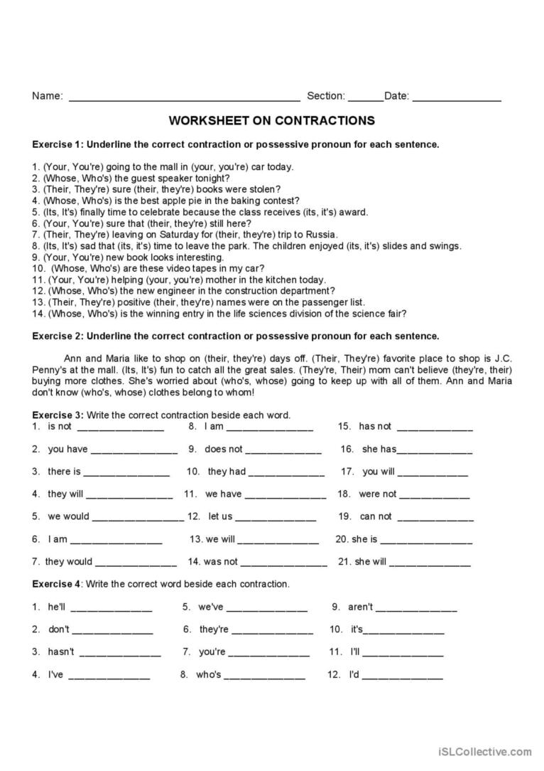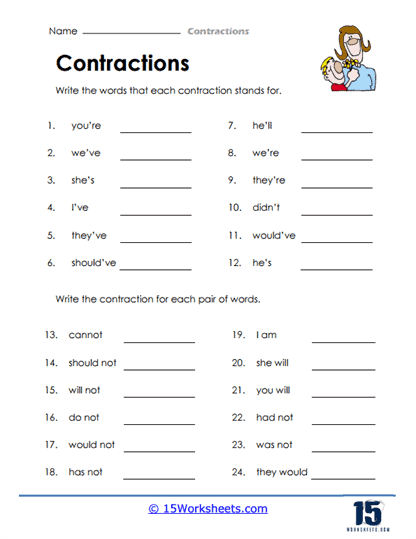 Contractions worksheets are valuable tools for students to practice and reinforce their understanding of contractions. These worksheets typically include a mix of fill-in-the-blank exercises, matching activities, and sentence writing tasks. By engaging with these worksheets, students can improve their grasp of contractions and enhance their writing skills.