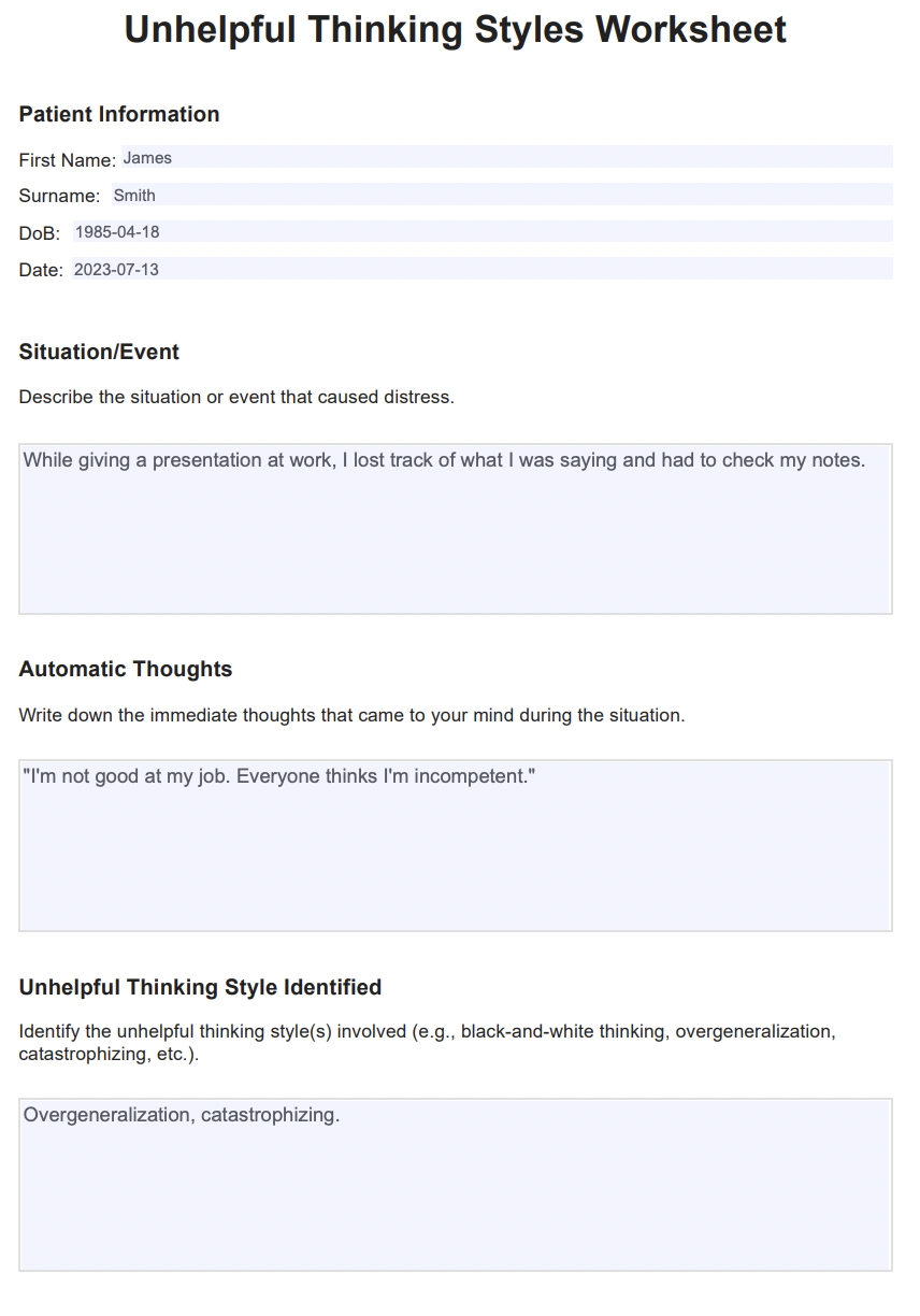 Once these distortions are identified, the worksheet guides individuals to challenge and reframe these thoughts by asking questions such as: “Is there evidence to support this thought?” “What would I say to a friend in this situation?” “What is a more balanced perspective?” This process can help individuals gain a more realistic and positive outlook on the situation.