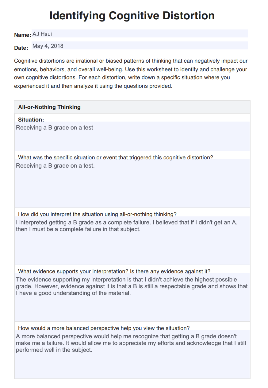 By regularly using a distorted thinking worksheet, individuals can develop a greater awareness of their thinking patterns and learn to challenge and change them over time. This tool can be particularly helpful in managing stress, anxiety, depression, and other mental health concerns.
