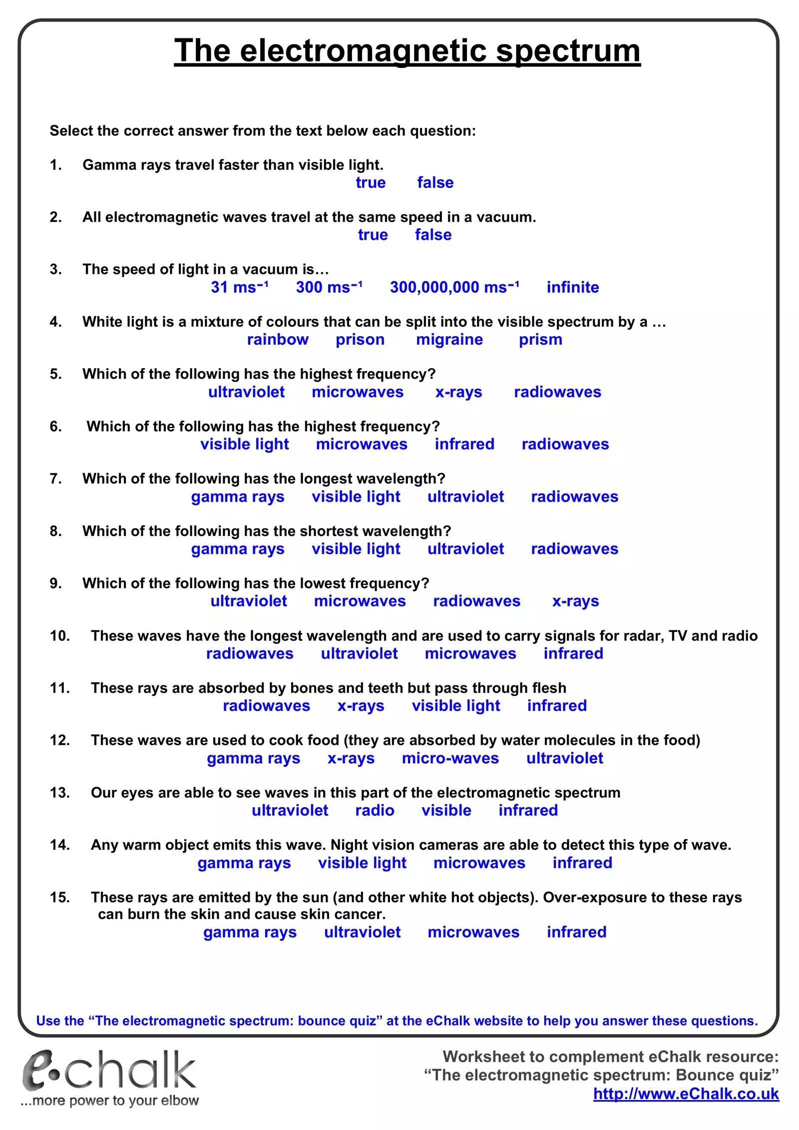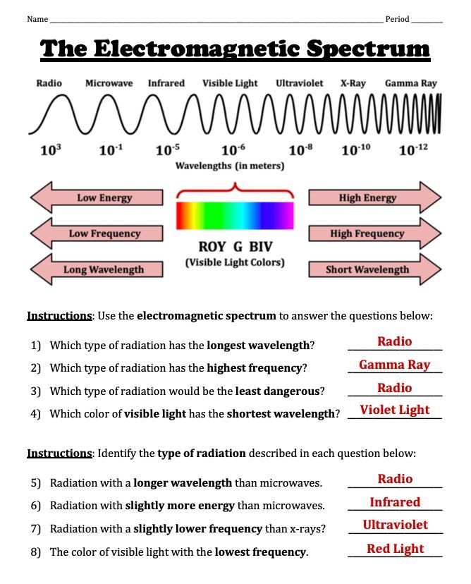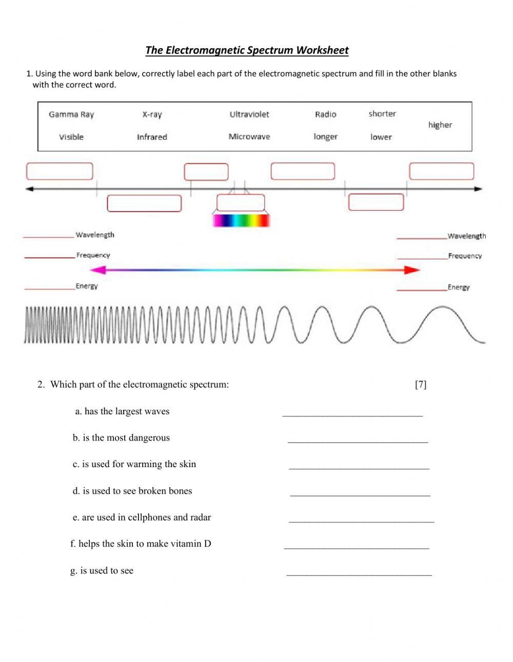 By completing a worksheet on the electromagnetic spectrum, students can test their knowledge and see how well they grasp the various concepts related to this topic. This hands-on approach can help solidify their understanding and make learning about the electromagnetic spectrum more engaging and interactive.