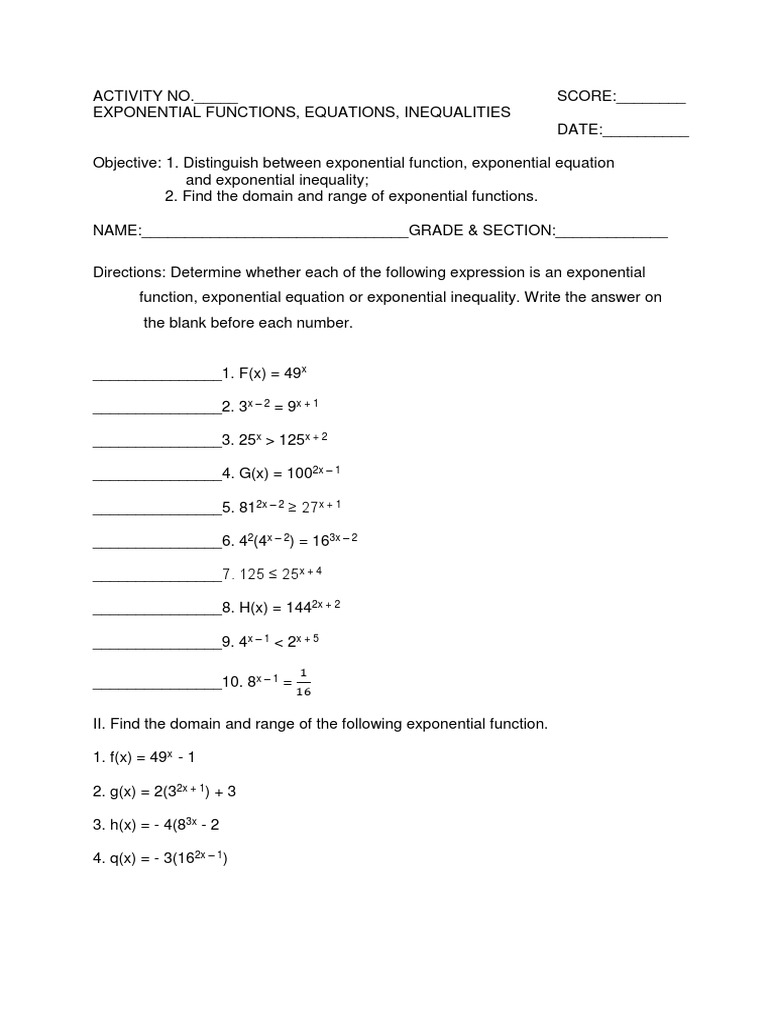 A worksheet on exponential functions is a valuable tool for students to practice and reinforce their knowledge of this topic. It typically includes a series of problems that require students to solve exponential equations, graph exponential functions, and apply exponential growth and decay formulas. By working on such a worksheet, students can improve their understanding of exponential functions and develop their problem-solving skills.