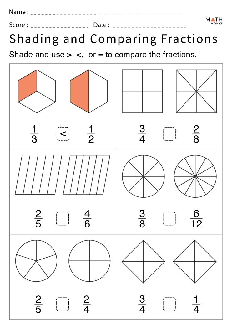 One common type of worksheet is identifying fractions. Students may be presented with shapes divided into equal parts and asked to identify the fraction represented by a shaded portion. This helps students visualize fractions and understand the concept of parts of a whole. Comparing fractions worksheets require students to compare two fractions and determine which is greater or lesser. This helps students understand the concept of equivalent fractions and how to compare different fractions.
