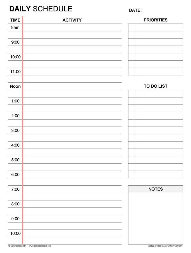 Having a daily schedule is essential for staying organized and productive. With a busy lifestyle, it can be challenging to keep track of all your tasks and appointments. That’s where a daily schedule template comes in handy. By using a printable template, you can easily plan out your day and ensure that you don’t forget any important tasks.