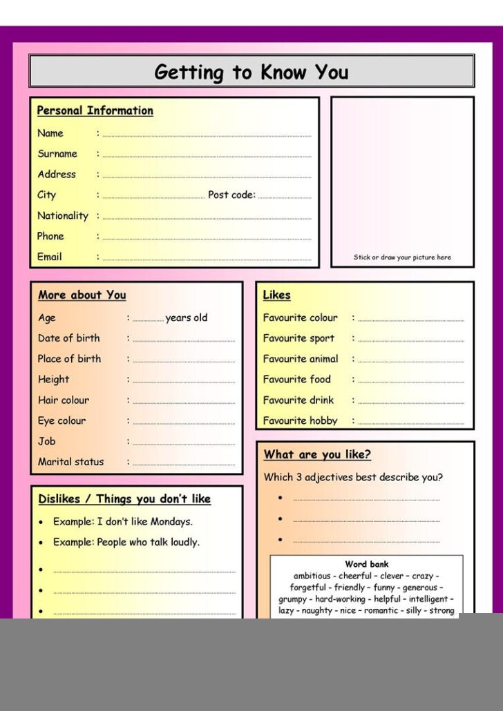 Getting to know you worksheets are a great way to break the ice and build connections with new people. Whether you are meeting new classmates, colleagues, or friends, these worksheets can help facilitate meaningful conversations and create a sense of community.