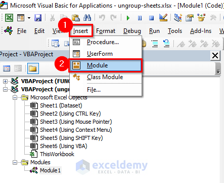 5. After pasting the code, run the macro by pressing F5 or clicking on the “Run” button in the VBA editor. This will ungroup all the worksheets in the Excel workbook.