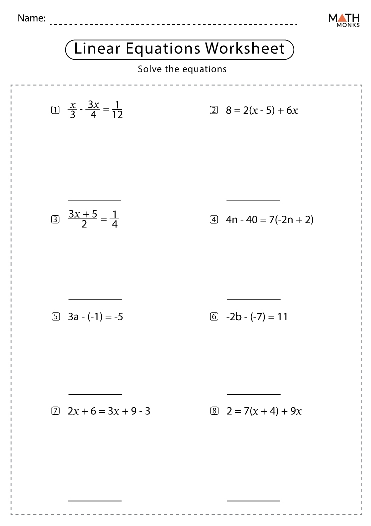 Word problems are also common on linear equation worksheets. These problems require students to translate a real-world situation into an equation and solve for the unknown variable. Word problems help students see the practical applications of linear equations and develop problem-solving skills. They also encourage critical thinking and reasoning.