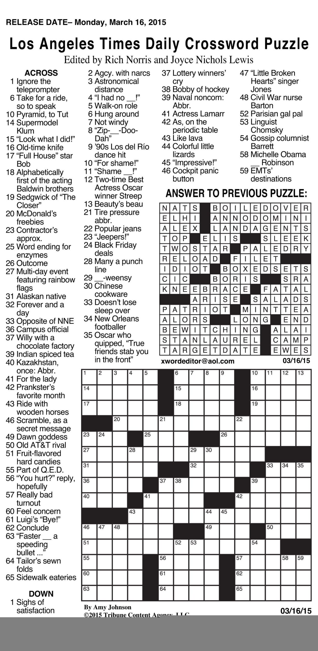 Los Angeles Times Crossword Puzzle for Today Printable PDF Free