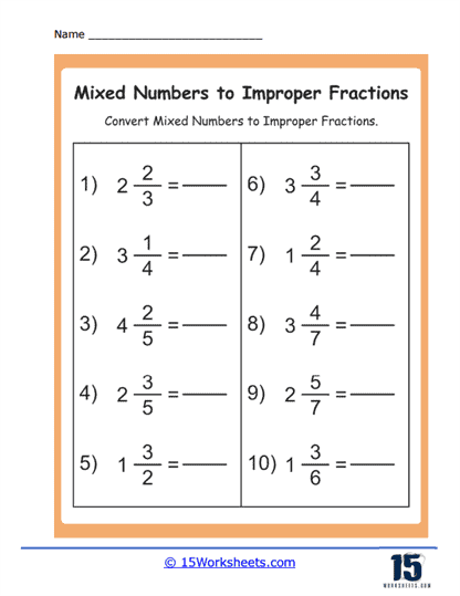 Mixed Number to Improper Fraction Worksheet