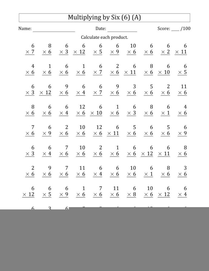 These worksheets typically consist of a series of multiplication problems where students are required to multiply a given number by 6. This repetitive practice helps reinforce the multiplication table of 6 in the students’ minds and allows them to develop a strong foundation in multiplication.
