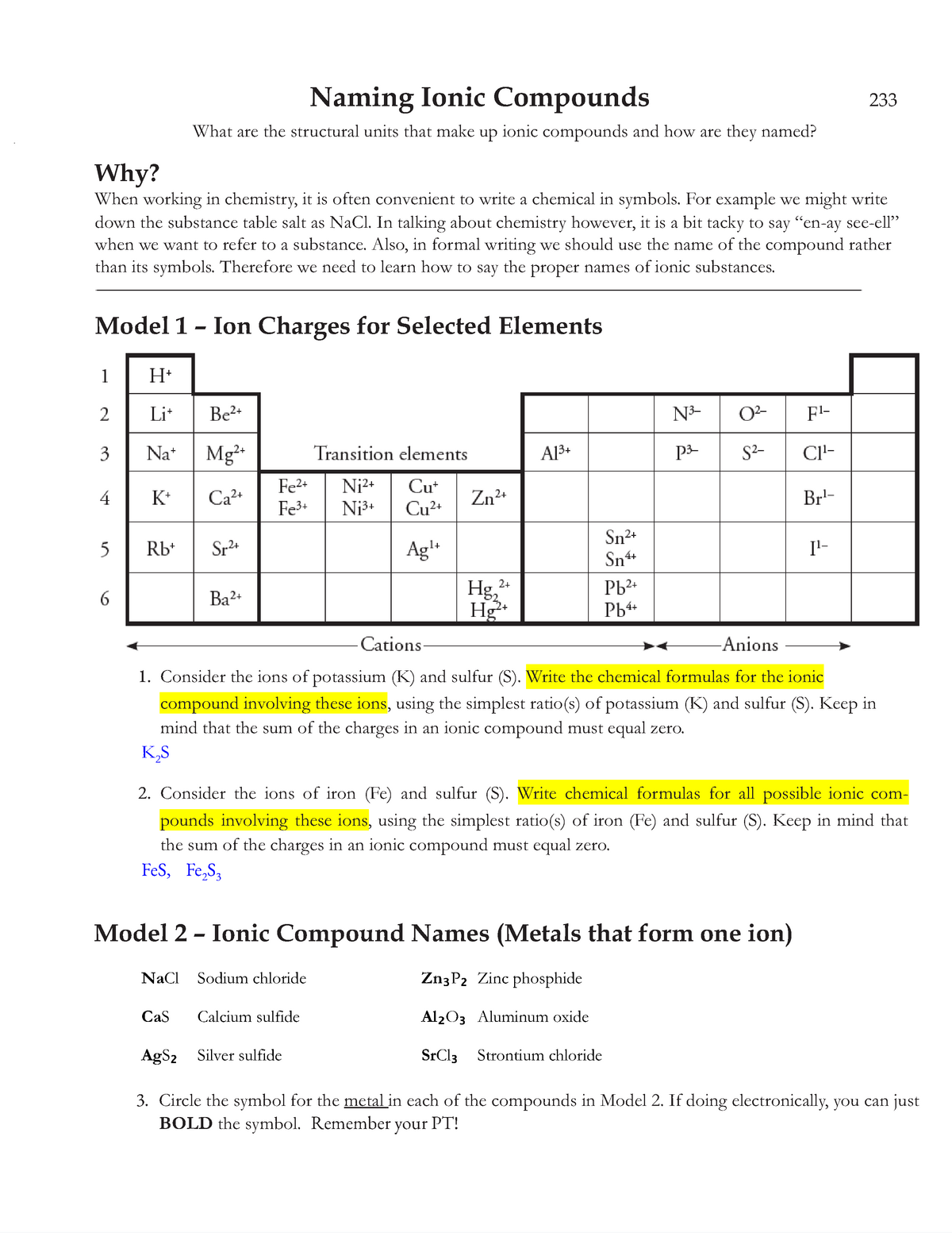 A naming ionic bonds worksheet typically includes a series of chemical formulas that students must analyze and name according to the rules of ionic bonding. This may involve identifying the cation and anion in each compound, determining their charges, and combining them to form the correct name of the compound. Worksheets may also include practice problems that require students to write chemical formulas based on the given names of ionic compounds.