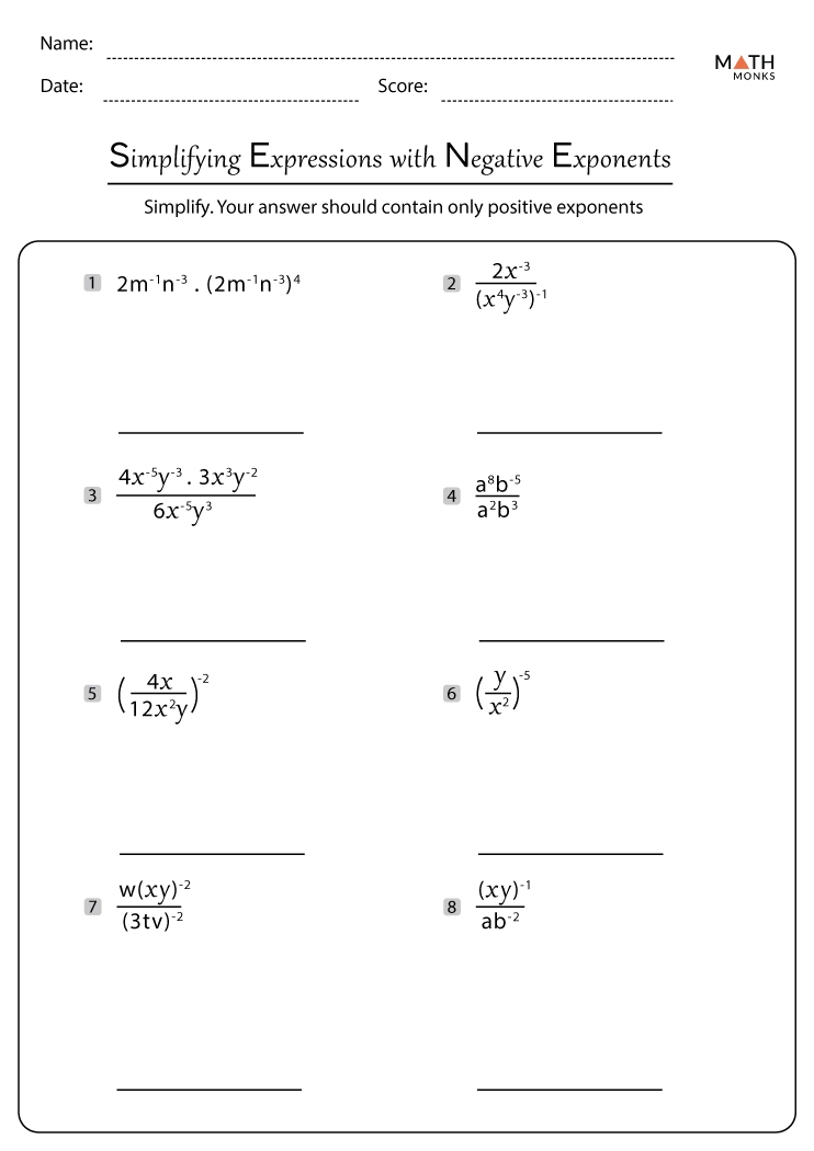One effective way to practice and reinforce the understanding of negative exponents is through worksheets. Worksheets provide students with opportunities to apply their knowledge, practice problem-solving skills, and reinforce concepts through repetition.