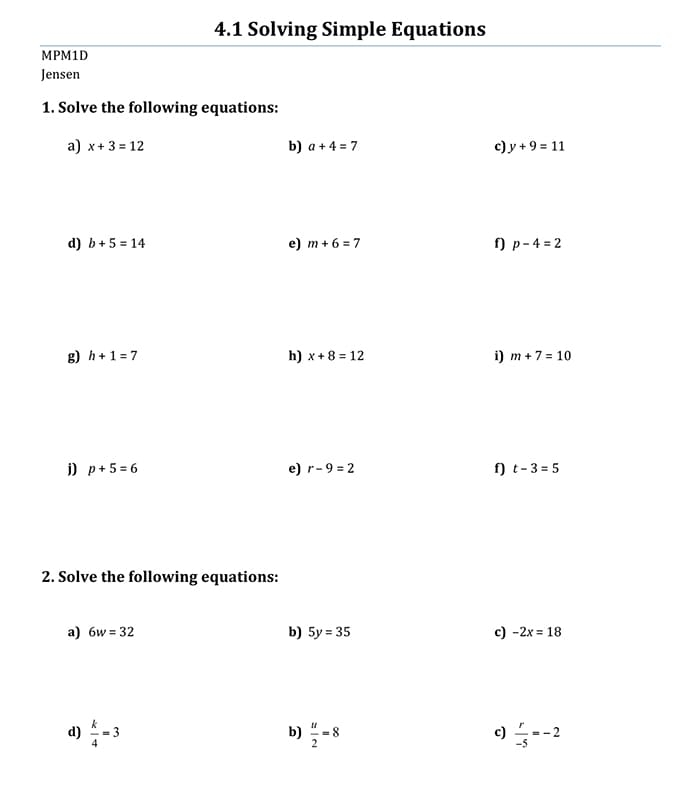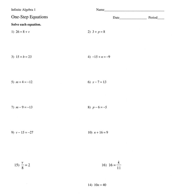 Here is a sample one step equation worksheet that students can use to practice solving equations: