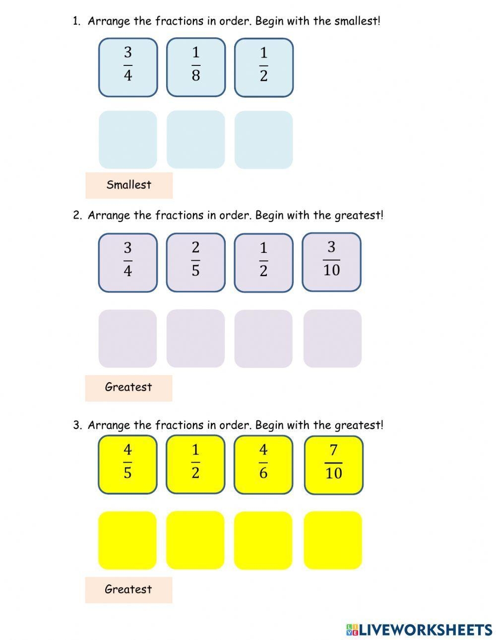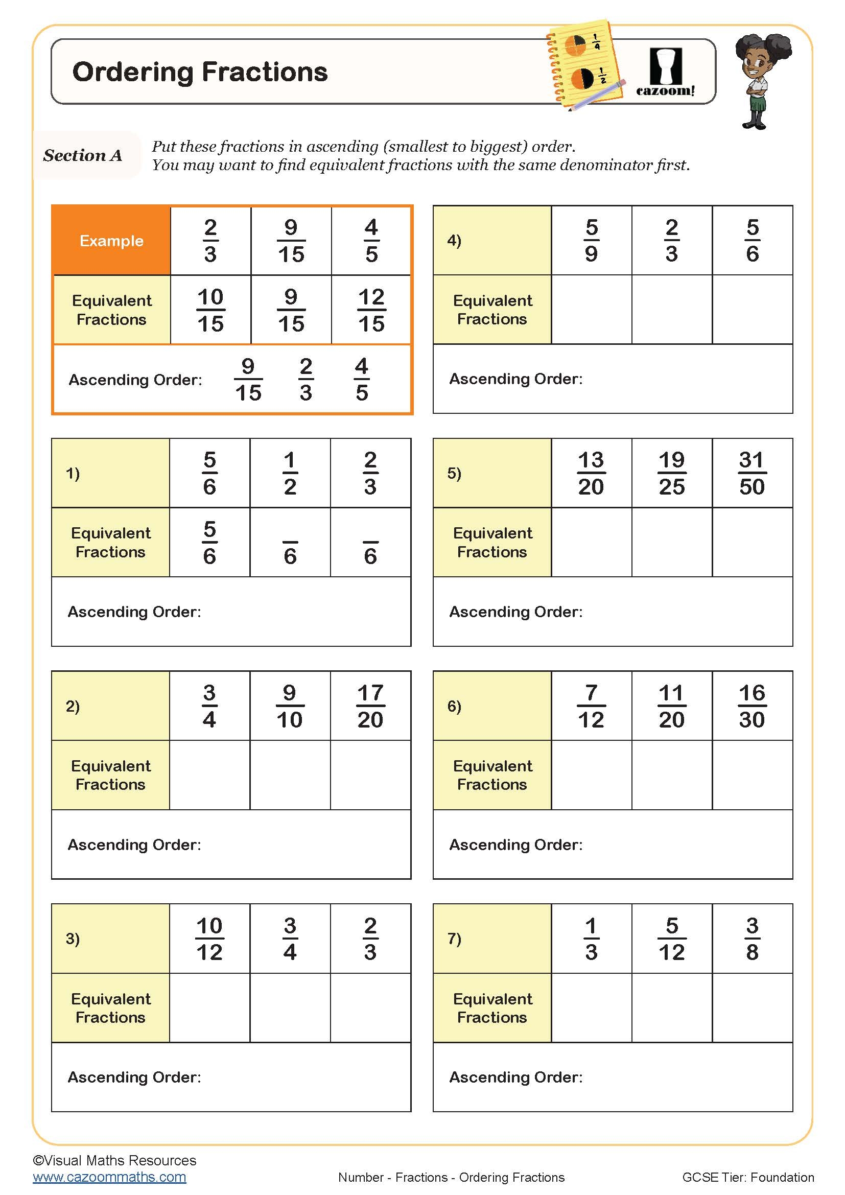 A great way to practice ordering fractions is through the use of worksheets. Ordering fractions worksheets provide students with a variety of fraction sets that they must arrange in the correct order. These worksheets can include fractions with different denominators and require students to compare the fractions and determine their relative sizes.
