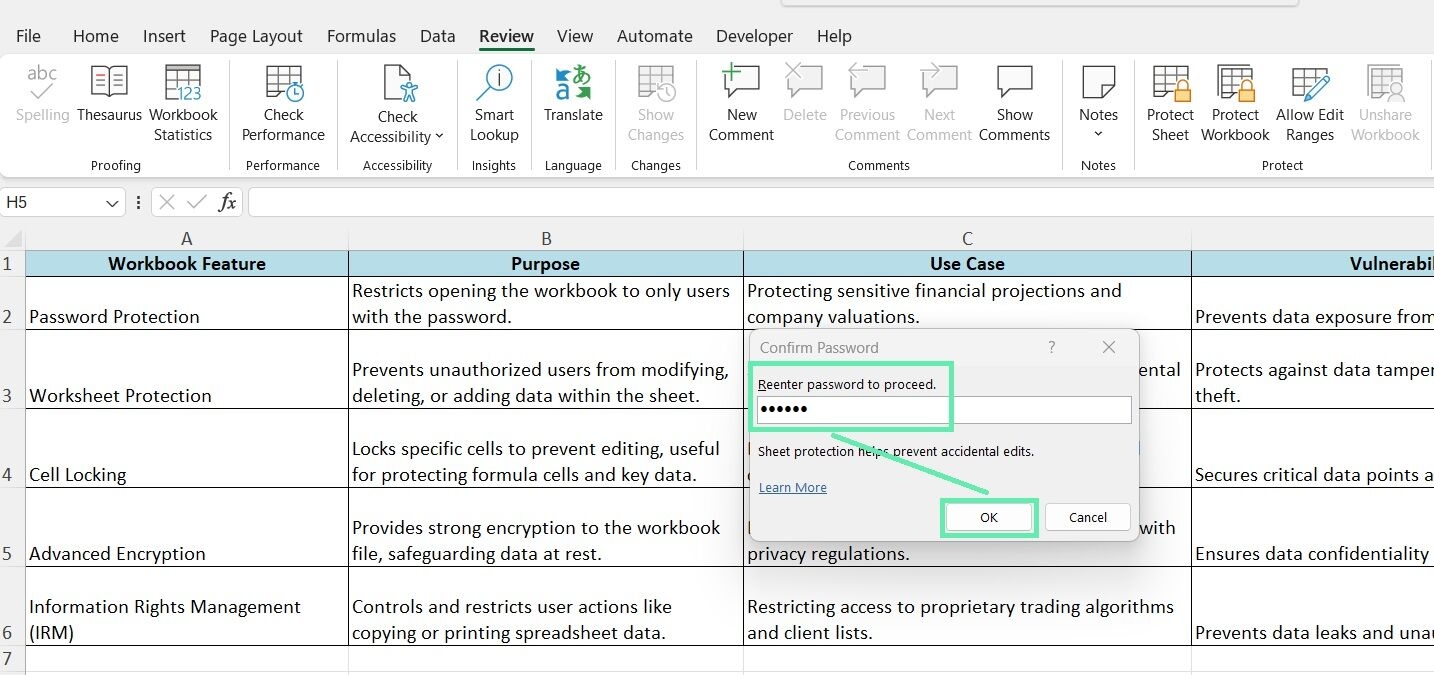 5. Once you have set the password and selected the desired options, click ‘OK’ to apply the protection to the worksheet.