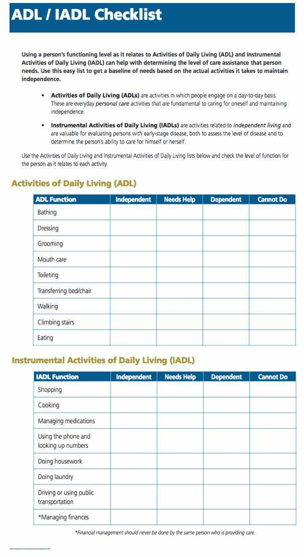 Printable Activities Of Daily Living Checklist