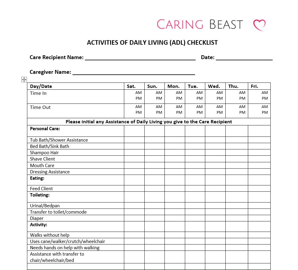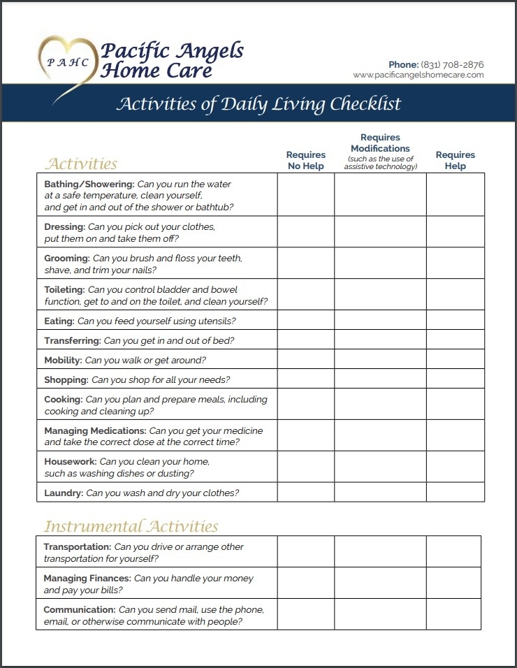 Download and Print printable activities of daily living checklist Listed below