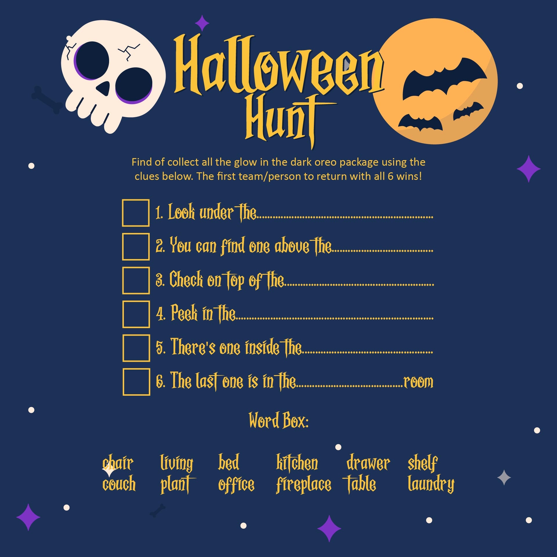If you’re looking for a more active game, try a printable scavenger hunt. Create a list of Halloween-themed items or clues for players to find around your home or neighborhood. This can be a fun and interactive way to get everyone involved in the Halloween fun.