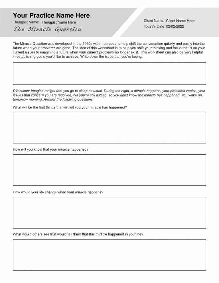 Creating a printable miracle question worksheet can be a helpful way to guide yourself or others through this exercise. By putting pen to paper and really thinking through the details of your ideal future, you can gain clarity and motivation to start taking steps towards making it a reality.