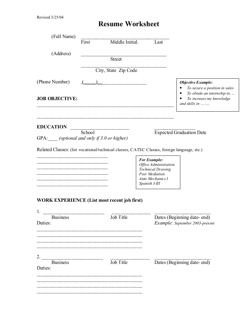 Another advantage of using a printable resume worksheet is that it can help you create a visually appealing layout for your resume. The worksheet will often provide a template or outline for you to follow, which can help ensure that your resume is easy to read and navigate. This can be especially helpful if you are not confident in your design skills or if you are applying for a job in a creative field where presentation is important.