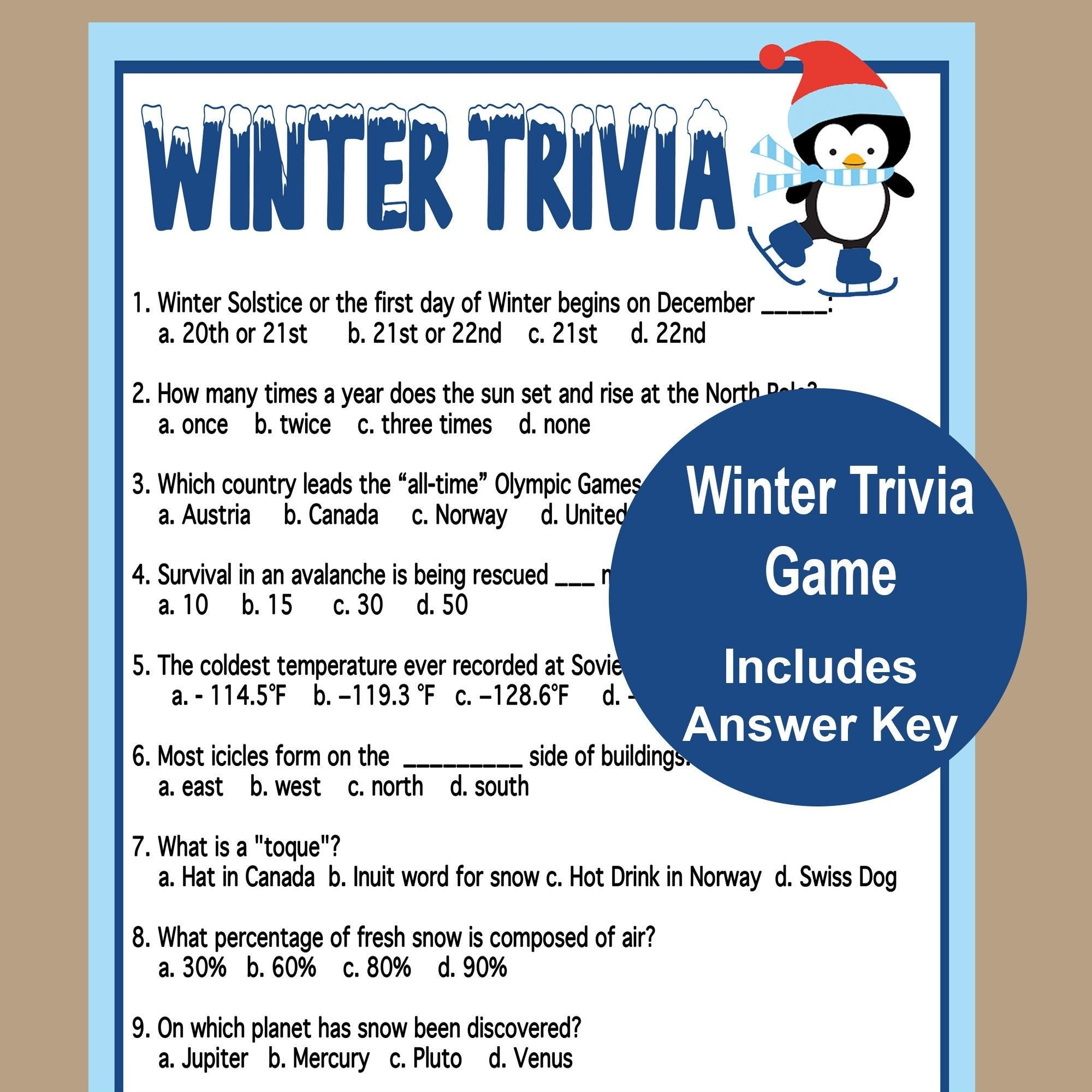 Winter Trivia Game Printable Winter Game Fun Winter Games Winter