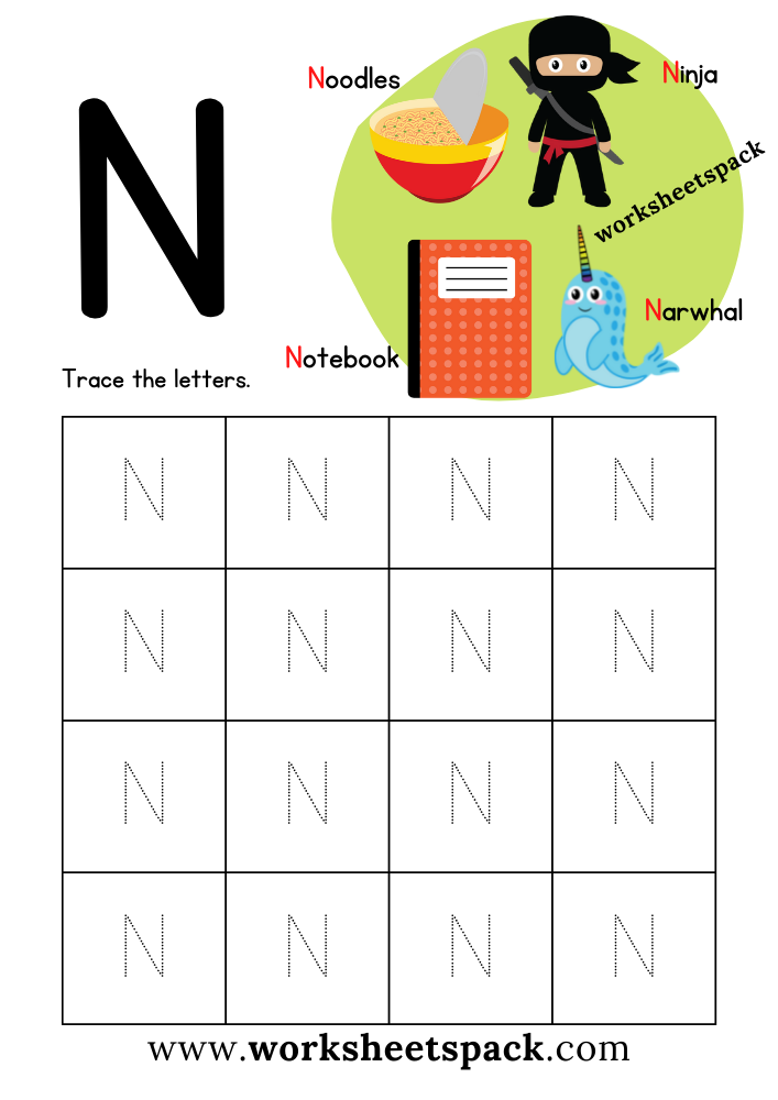 One of the first worksheets focuses on tracing the letter N. This helps children become familiar with the shape of the letter and practice their fine motor skills. The worksheet may include both uppercase and lowercase versions of the letter N for practice.