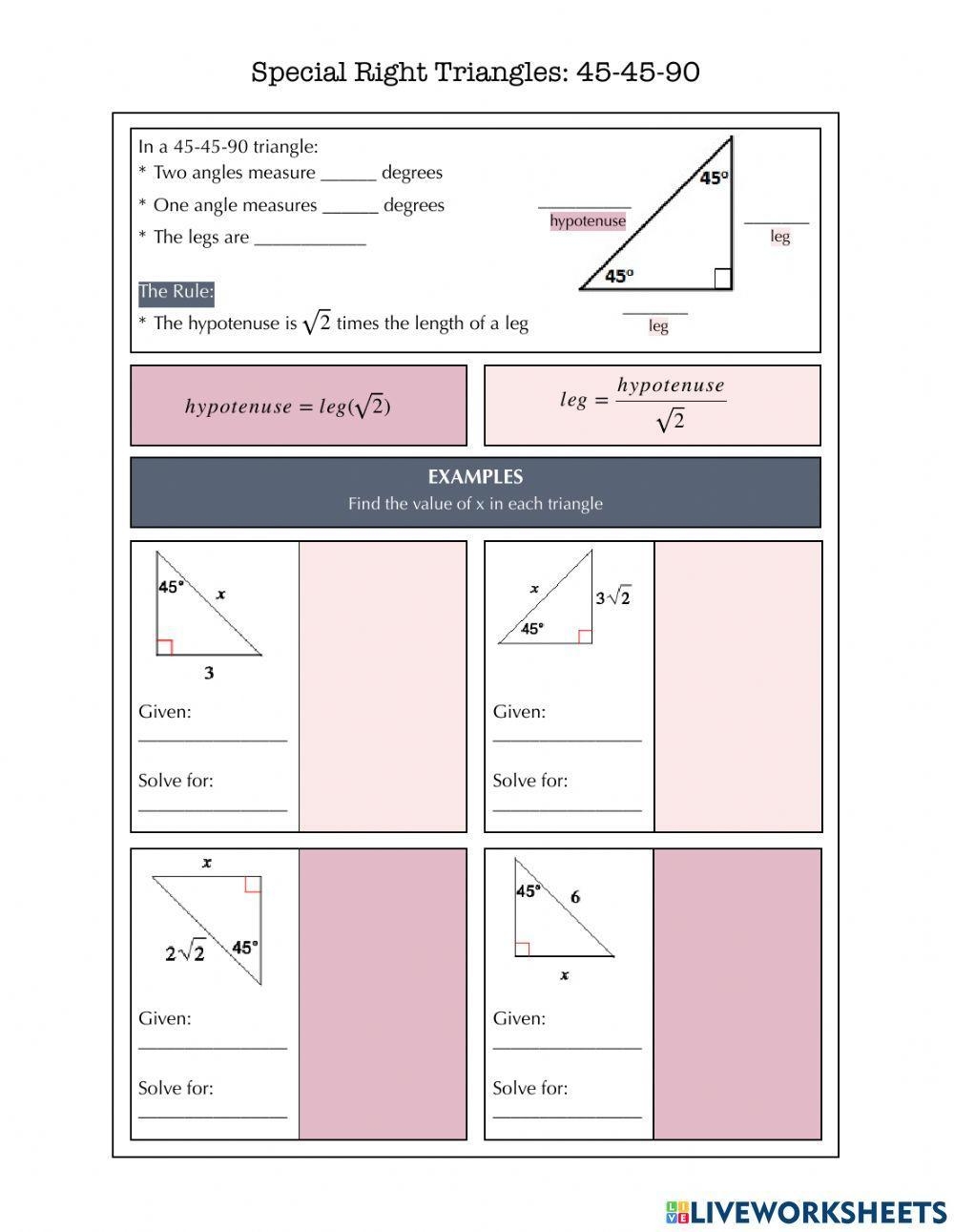 When working with special triangles, it is important to understand their properties and how to apply them in different situations. A worksheet on special triangles can help reinforce these concepts and provide practice problems for students to work on.