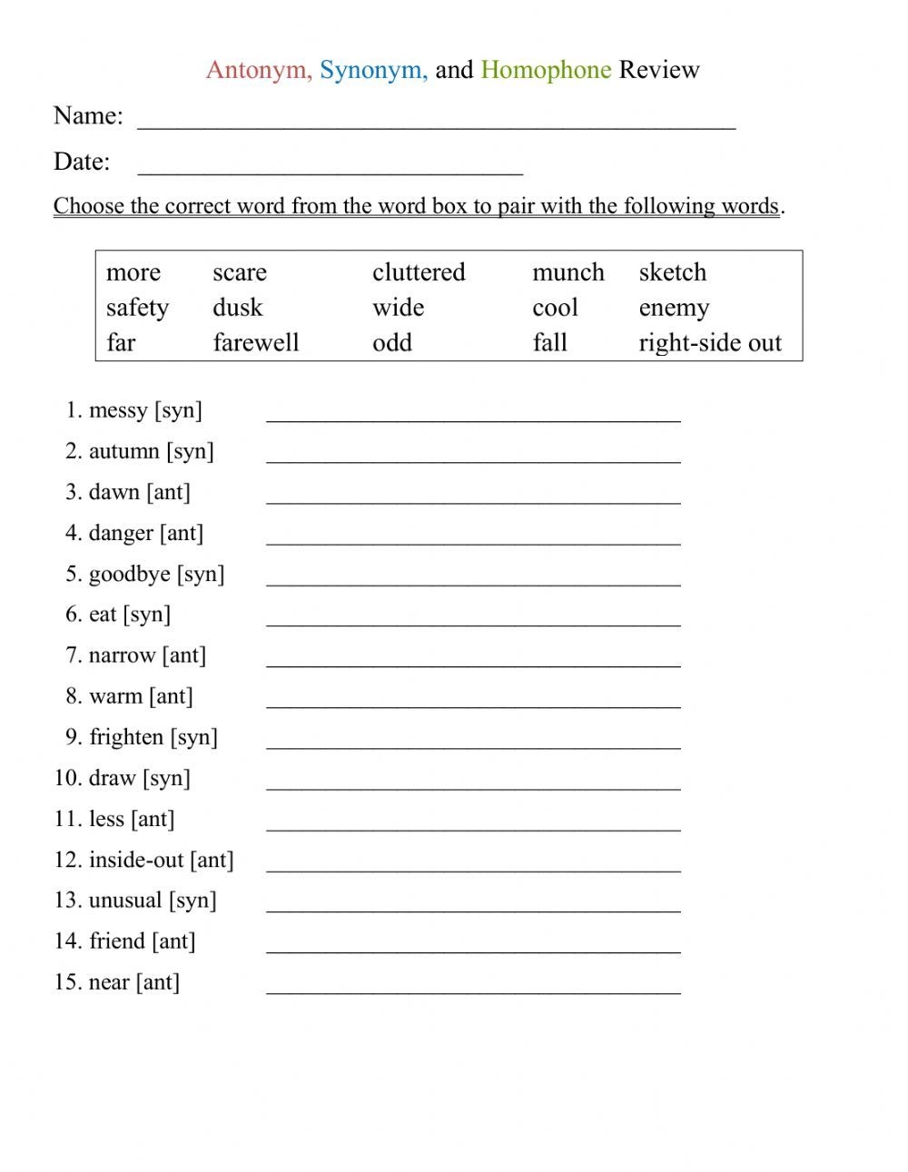 synonyms worksheet