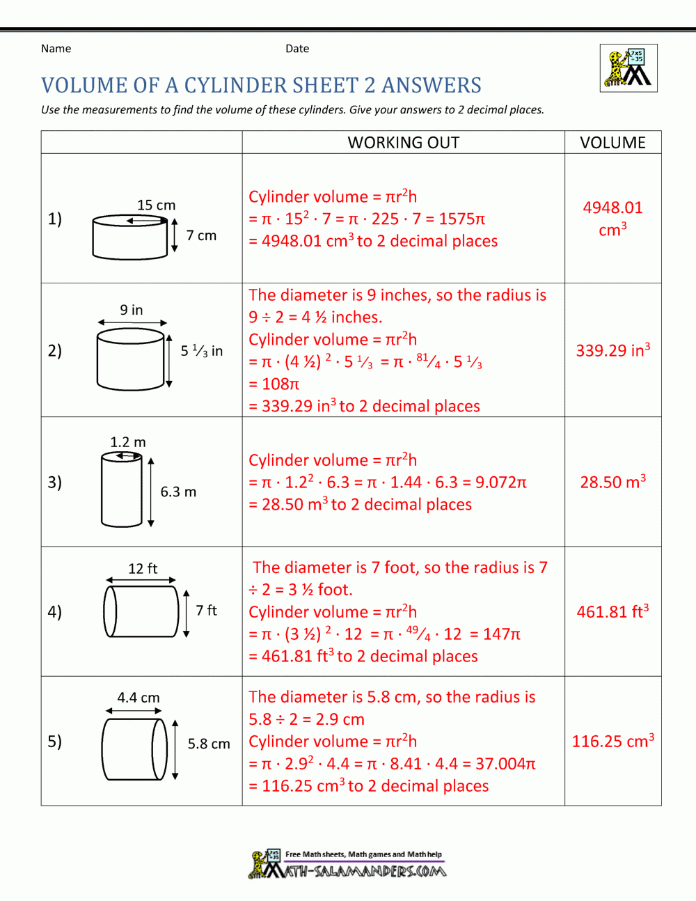 A worksheet on the volume of a cylinder typically consists of problems that require students to find the volume of cylinders with different dimensions. These problems may involve calculating the radius or diameter of the base, as well as the height of the cylinder. By solving these problems, students can improve their understanding of the formula for finding the volume of a cylinder and develop their problem-solving skills.